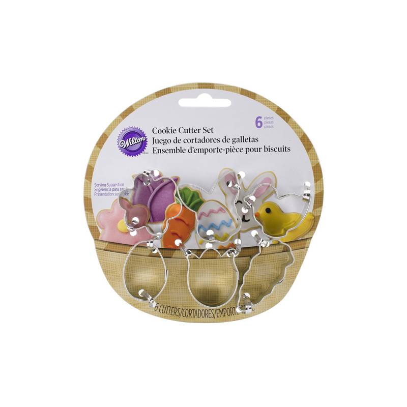 Este set de Wilton contiene 6 mini cortadores diferente con formas de flor, conejito, pollito, huevo, tulipán y zanahoria. perfecto para cortar masa de galletas y tambien para fondant, mazapán, etc....